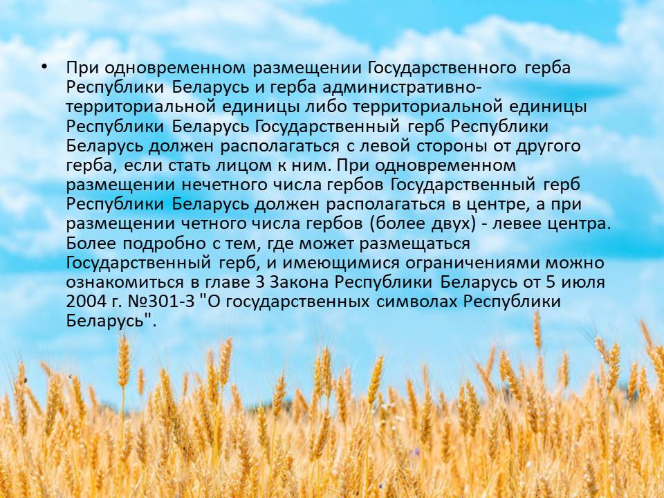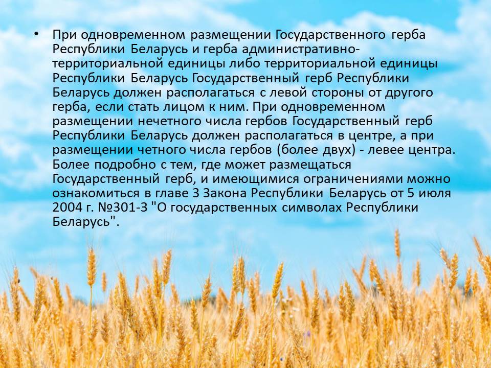 При одновременном размещении Государственного герба Республики Беларусь и герба административно-территориальной единицы либо территориальной единицы Республики Беларусь Государственный герб Республики Беларусь должен располагаться с левой стороны от другого герба, если стать лицом к ним. При одновременном размещении нечетного числа гербов Государственный герб Республики Беларусь должен располагаться в центре, а при размещении четного числа гербов (более двух) - левее центра. Более подробно с тем, где может размещаться Государственный герб, и имеющимися ограничениями можно ознакомиться в главе 3 Закона Республики Беларусь от 5 июля 2004 г. №301-З "О государственных символах Республики Беларусь".