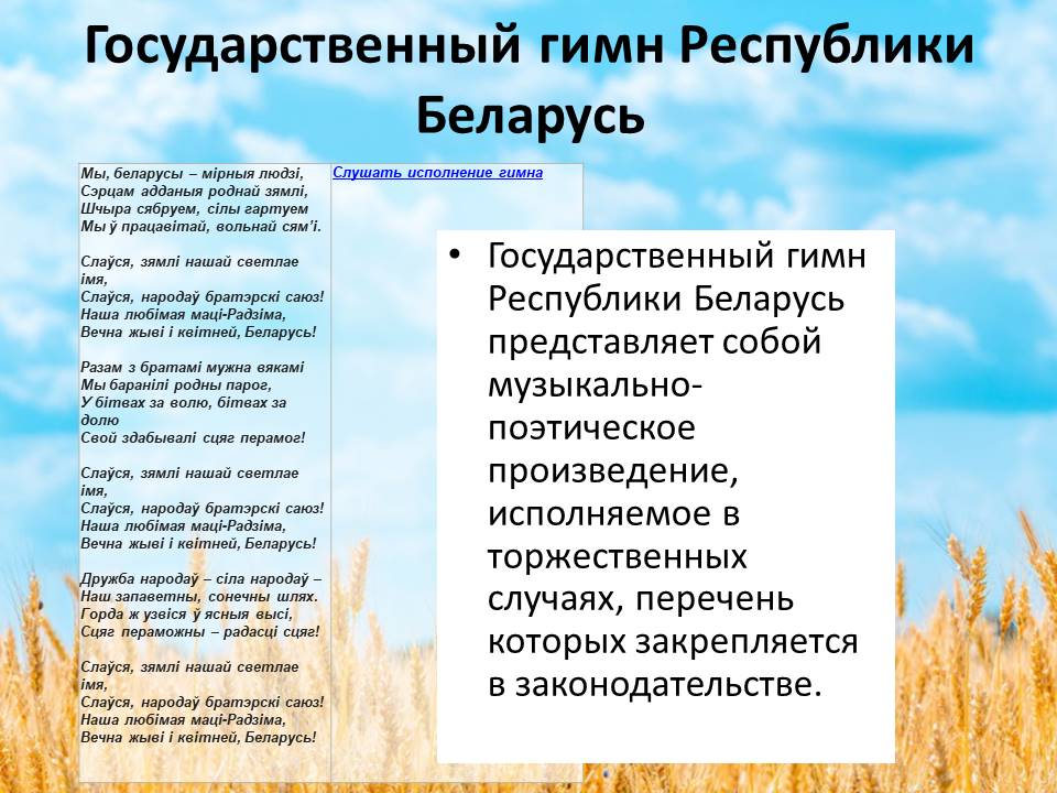 Государственный гимн Республики Беларусь представляет собой музыкально-поэтическое произведение, исполняемое в торжественных случаях, перечень которых закрепляется в законодательстве.
