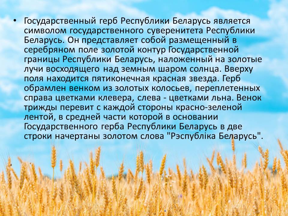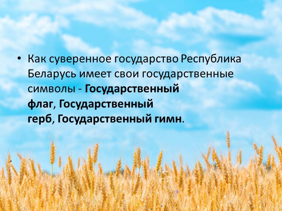 Как суверенное государство Республика Беларусь имеет свои государственные символы - Государственный флаг, Государственный герб, Государственный гимн.