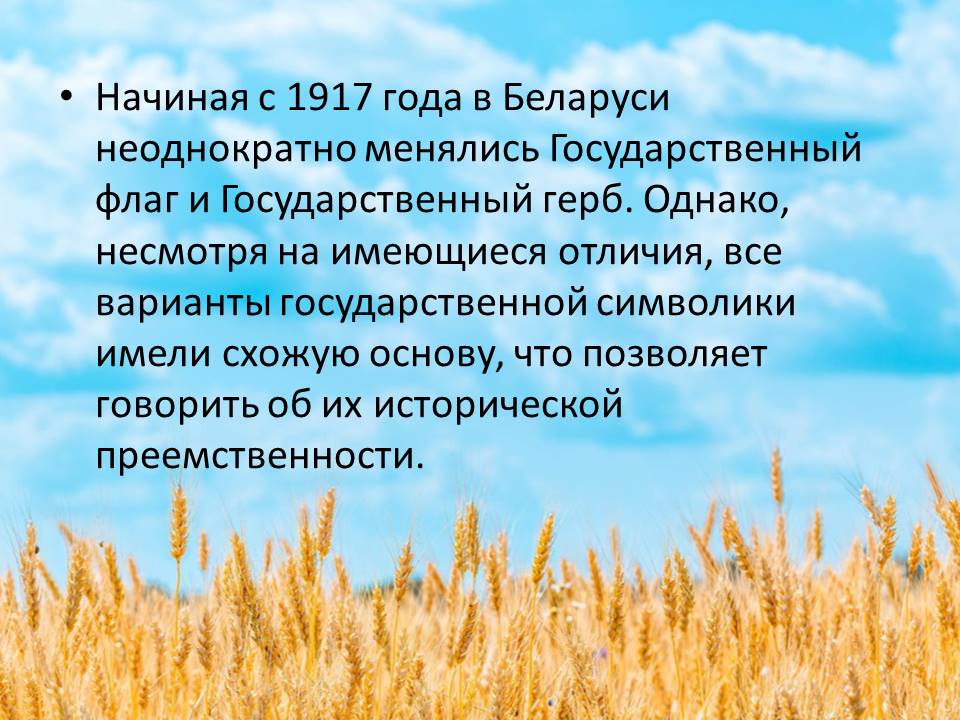 Начиная с 1917 года в Беларуси неоднократно менялись Государственный флаг и Государственный герб. Однако, несмотря на имеющиеся отличия, все варианты государственной символики имели схожую основу, что позволяет говорить об их исторической преемственности.