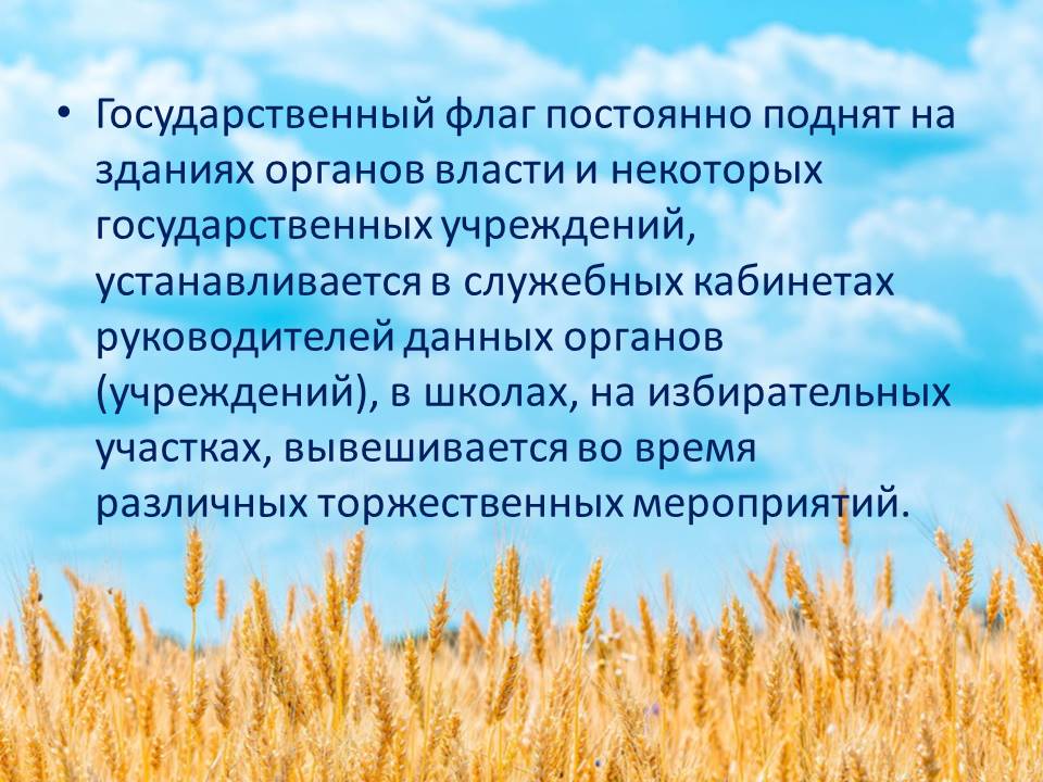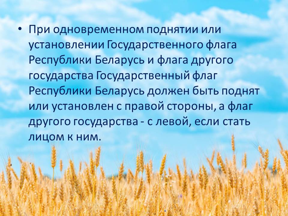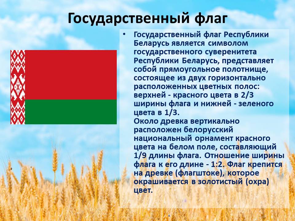 Государственный флаг Республики Беларусь является символом государственного суверенитета Республики Беларусь, представляет собой прямоугольное полотнище, состоящее из двух горизонтально расположенных цветных полос: верхней - красного цвета в 2/3 ширины флага и нижней - зеленого цвета в 1/3. Около древка вертикально расположен белорусский национальный орнамент красного цвета на белом поле, составляющий 1/9 длины флага. Отношение ширины флага к его длине - 1:2. Флаг крепится на древке (флагштоке), которое окрашивается в золотистый (охра) цвет. Государственный флаг постоянно поднят на зданиях органов власти и некоторых государственных учреждений, устанавливается в служебных кабинетах руководителей данных органов (учреждений), в школах, на избирательных участках, вывешивается во время различных торжественных мероприятий. При одновременном поднятии или установлении Государственного флага Республики Беларусь и флага другого государства Государственный флаг Республики Беларусь должен быть поднят или установлен с правой стороны, а флаг другого государства - с левой, если стать лицом к ним.