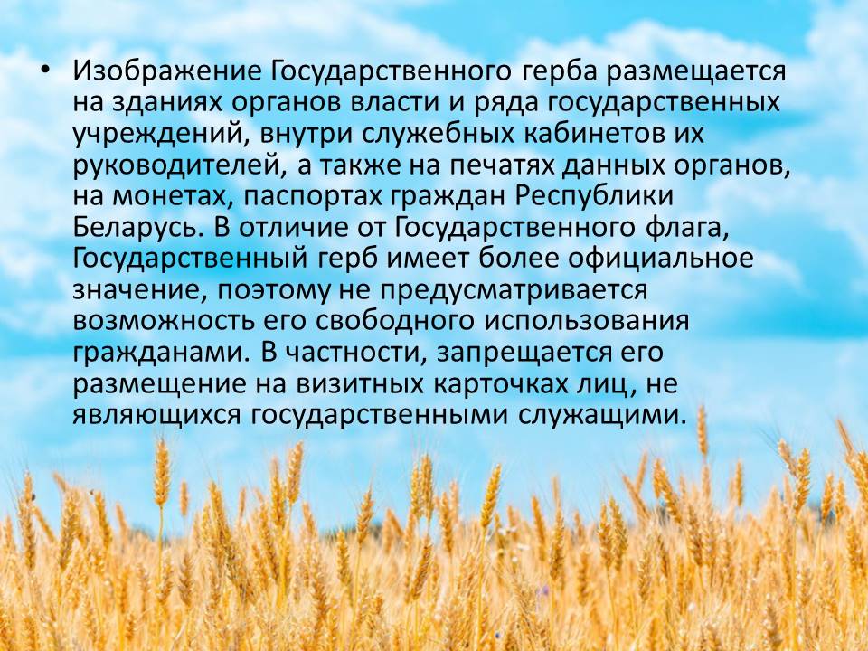 Государственный герб Республики Беларусь является символом государственного суверенитета Республики Беларусь. Он представляет собой размещенный в серебряном поле золотой контур Государственной границы Республики Беларусь, наложенный на золотые лучи восходящего над земным шаром солнца. Вверху поля находится пятиконечная красная звезда. Герб обрамлен венком из золотых колосьев, переплетенных справа цветками клевера, слева - цветками льна. Венок трижды перевит с каждой стороны красно-зеленой лентой, в средней части которой в основании Государственного герба Республики Беларусь в две строки начертаны золотом слова "Рэспубліка Беларусь". Изображение Государственного герба размещается на зданиях органов власти и ряда государственных учреждений, внутри служебных кабинетов их руководителей, а также на печатях данных органов, на монетах, паспортах граждан Республики Беларусь. В отличие от Государственного флага, Государственный герб имеет более официальное значение, поэтому не предусматривается возможность его свободного использования гражданами. В частности, запрещается его размещение на визитных карточках лиц, не являющихся государственными служащими. При одновременном размещении Государственного герба Республики Беларусь и герба административно-территориальной единицы либо территориальной единицы Республики Беларусь Государственный герб Республики Беларусь должен располагаться с левой стороны от другого герба, если стать лицом к ним. При одновременном размещении нечетного числа гербов Государственный герб Республики Беларусь должен располагаться в центре, а при размещении четного числа гербов (более двух) - левее центра. Более подробно с тем, где может размещаться Государственный герб, и имеющимися ограничениями можно ознакомиться в главе 3 Закона Республики Беларусь от 5 июля 2004 г. №301-З "О государственных символах Республики Беларусь".
