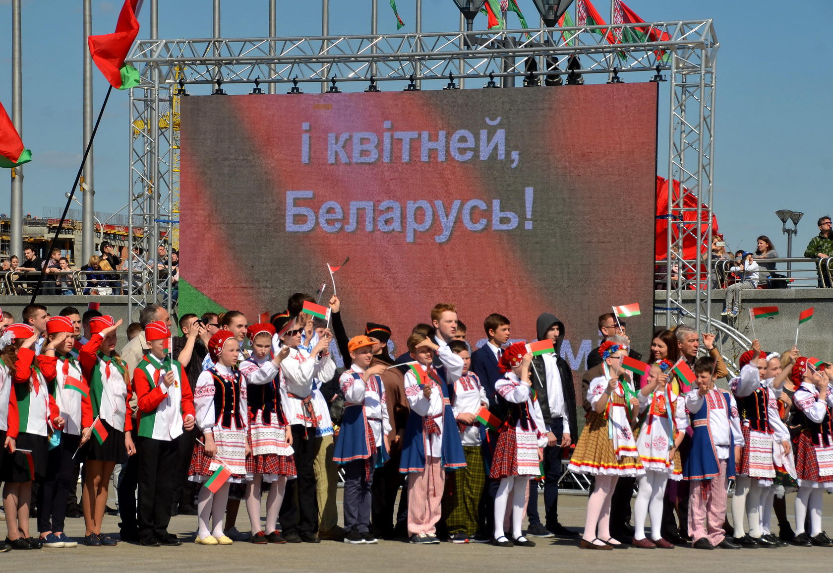 Дружба народаў – сіла народаў – Наш запаветны, сонечны шлях. Горда ж узвіся ў ясныя высі, Сцяг пераможны – радасці сцяг!
